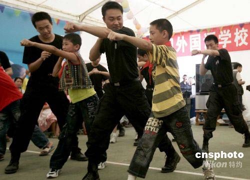 6月1日,在四川綿陽九州體育館受災民眾安置區(qū),幾名男孩向特警學習軍體拳。中新社發(fā) 杜洋 攝