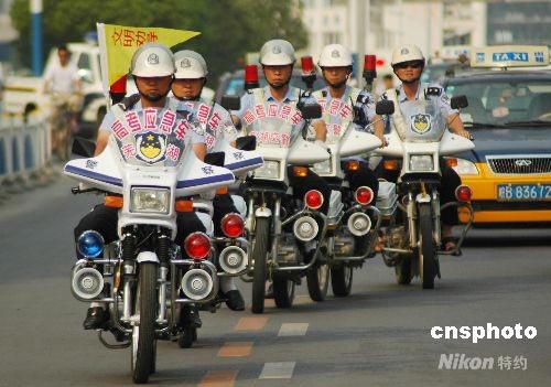 6月3日,高考應急服務小分隊亮相蕪湖街頭。當天,安徽蕪湖市交警支隊組織40輛巡邏車準備在高考期間為考生服務,其中17輛“高考應急摩托車”分布在蕪湖市各考點,為考生和家長處理突發(fā)事件。中新社發(fā) 老春 攝