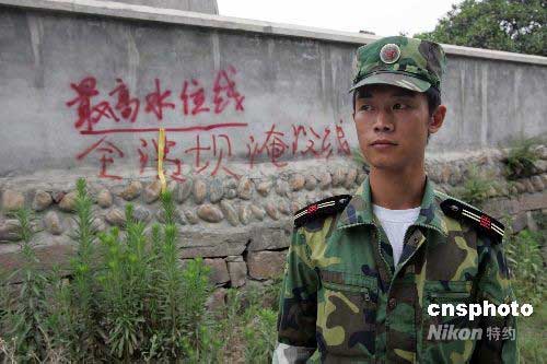6月6日,四川民兵在唐家山堰塞湖下游60公里處的九嶺鎮(zhèn)七窯村執(zhí)勤,禁止任何人員進入地勢較低的危險地段,身后“最高水位線”的字樣清晰可見。中新社發(fā) 杜洋 攝