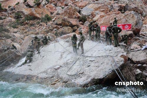6月7日,經(jīng)過解放軍官兵和鐵路職工25個(gè)晝夜的連續(xù)奮戰(zhàn),寶成鐵路109隧道段嘉陵江堰塞湖被成功疏通,這標(biāo)志著預(yù)計(jì)在6月中旬疏通的109隧道和嘉陵江河道提前全部搶通。5月12日,四川汶川8級(jí)特大地震造成西安鐵路局管內(nèi)寶成線109隧道附近山體突然坍塌,連接西北和西南的交通大動(dòng)脈寶成鐵路中斷。約12萬方巨石將隧道旁的嘉陵江河道完全堵塞,形成一條長3.4公里、積水約100萬立方米的堰塞湖,嚴(yán)重威脅到寶成鐵路和沿江人民群眾生命財(cái)產(chǎn)安全。目前,解放軍官兵和鐵路職工已清理出一條長215米、寬25至50米、平均深度約5米的導(dǎo)流渠,基本達(dá)到迎夏度汛的要求。 中新社發(fā) 唐振江 攝