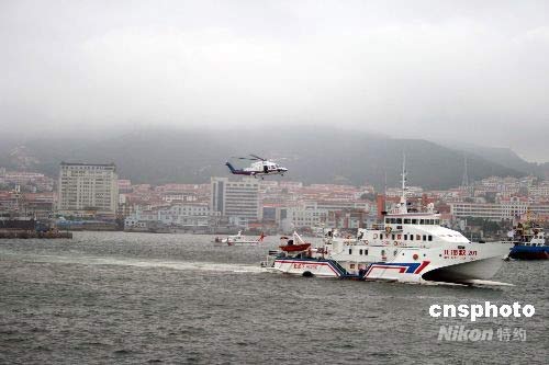 6月23日下午,山東省威海市在威海灣舉行大規(guī)模?樟Ⅲw搜救與船舶污染應急演習,檢驗威海海域奧運期間海上安全監(jiān)管與救助的能力。來自交通運輸部北海救助局、交通運輸部北海第一救助飛行隊、山東海事局海上巡查執(zhí)法支隊、陸軍和海軍駐威某部的11艘各類船舶、1架救助直升機參加了演習。此次演習重點演練了海上交通管制、海上交通事故人命救助、船舶消防和船舶溢油圍控等。中新社發(fā) 李志強 攝