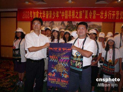 7月25日,由39名加拿大華裔青少年組成的“中國尋根之旅”夏令營在國際旅游名城桂林開營,廣西區(qū)僑辦官員給夏令營增送壯族禮物“壯錦”。據(jù)介紹,此次為期9天的夏令營活動是由中國國務(wù)院僑務(wù)辦公室主辦,廣西區(qū)僑辦承辦,夏令營成員將游覽廣西桂林、南寧、北海3個旅游城市,學(xué)習(xí)中國文化常識,了解廣西民族民俗風(fēng)情。中新社發(fā) 周利朔 攝
