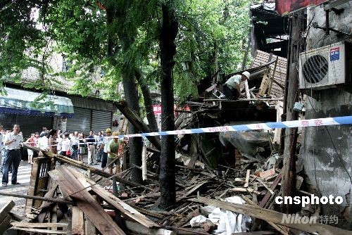 7月30日清晨,受今年第八號臺風(fēng)“鳳凰”影響,福州市臺江區(qū)隆平巷一兩層木屋在雨中倒塌,當(dāng)時屋內(nèi)有一家3口,其中父子兩人受傷。中新社發(fā) 小小 攝