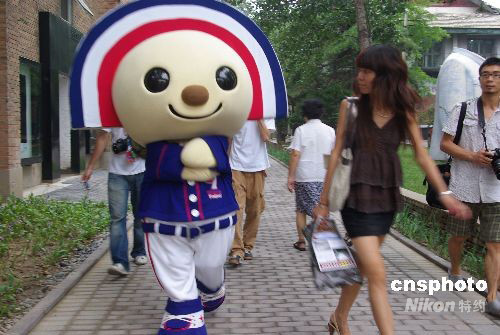 8月13日,中華臺(tái)北棒球隊(duì)吉祥物OPEN小將亮相北京,引起游客極大興趣和好奇。中新社發(fā) 九州 攝