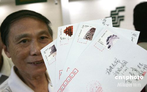 八月二十四日上午,北京奧運會最后一天,一位老伯在福州市郵電大樓高興地拿著剛買到的《奧運會從北京到倫敦》紀念郵票!秺W運會從北京到倫敦》紀念郵票,由中國國家郵政局和英國郵政聯(lián)合發(fā)行。 中新社發(fā) 楊婀娜 攝