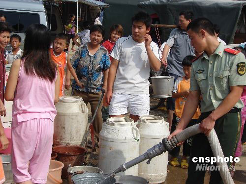 8月30日至9月1日,廣西柳州市柳城縣因水廠機器爆裂,造成縣城停水,4萬多人飽受缺水之苦。水廠方面稱目前仍在搶修,爭取盡快恢復(fù)供水。柳城消防官兵為當(dāng)?shù)孛癖娝退越馊济贾。中新社發(fā) 莫洪立 攝