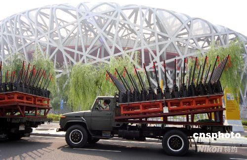 9月17日下午,多輛焰火禮炮專用車開到國家體育場“鳥巢”,迎接2008北京殘奧會閉幕式。 中新社發(fā) 吳芒子 攝