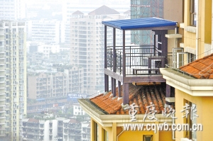 32樓的高空竟搭建起一個(gè)近20平米的陽(yáng)臺(tái)(如圖)。除了驚嘆,網(wǎng)友們戲稱(chēng)之為“重慶最牛陽(yáng)臺(tái)”、“重慶第九奇跡建筑”。