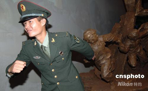 9月20日下午,一名解放軍士兵在北京中國(guó)人民革命軍事博物館參加“‘萬(wàn)眾一心 眾志成城’--抗震救災(zāi)主題展覽”開幕活動(dòng)后,在觀展時(shí)即興在《人民教師》雕像擺奮勇拼搏的造型拍照留影。該展覽是由中共中央宣傳部、國(guó)家發(fā)展和改革委員會(huì)、解放軍總政治部共同主辦的,將于9月21日正式對(duì)公眾開放。此展為汶川大地震后,北京舉辦的反映抗震救災(zāi)工作,規(guī)模最大,文物最多,圖片形象最為詳盡的展覽之一。中新社發(fā) 鄒憲 攝