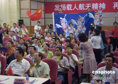 九月二十五日晚九時(shí)十分,“神七”順利升空。在上海航天局內(nèi),數(shù)百名為“神七”的研制付出辛勞汗水的航天工作者們,為“神七”的成功發(fā)射而歡呼雀躍。中新社發(fā) 宗晨亮 攝