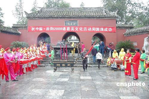 9月27日(農(nóng)歷八月二十八)是我國古代著名政治家、軍事家諸葛亮仙逝1774年忌日,也是明代世宗皇帝欽定的南陽臥龍崗祭拜諸葛亮的秋祭日。當天上午,以弘揚諸葛亮“鞠躬盡瘁,死而后已”精神為主旨的“中國南陽2008紀念諸葛亮文化活動周”在諸葛亮躬耕地——南陽市臥龍崗武侯祠隆重開幕,吸引眾多國內(nèi)外的專家、學者和游客前來參觀、朝圣和游覽。9月27日至10月2日“諸葛亮文化周”期間,武侯祠將舉行大型民間藝術表演、漢代樂舞表演、畫家走進臥龍崗、三國謎語有獎競猜、品嘗三國文化宴等豐富多彩的活動。中新社發(fā) 熊運彬 攝