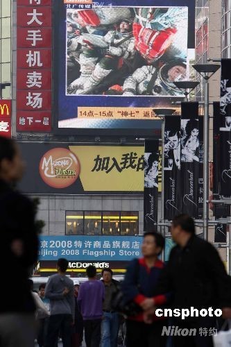 9月28日,神舟七號飛船返回艙順利著陸,北京市民在街頭觀看現(xiàn)場直播。中新社發(fā) 杜洋 攝