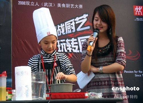 2008年10月1日,武漢市漢口航空路一廚藝大賽現(xiàn)場,11歲女童余秋萍上臺(tái)和成年人一起比賽烹調(diào)技藝。據(jù)了解,小學(xué)生余秋萍從9歲就開始學(xué)習(xí)廚藝,經(jīng)常在家炒菜做飯,認(rèn)為自己的手藝不錯(cuò),就報(bào)名參加了這次比賽。中新社發(fā) 孫新明 攝