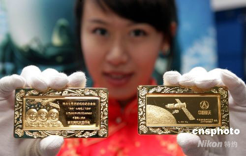 10月9日,為紀(jì)念神舟七號(hào)成功發(fā)射和中國(guó)首次太空行走圓滿成功,作為國(guó)家紀(jì)念 “神七”飛天活動(dòng)的重要組成部分,中國(guó)航天部門(mén)首次面向全球發(fā)行“金鑲鉆神七金條”!敖痂傘@神七金條”分45克、90克、300克和1000克四種規(guī)格,全部采用999純黃金制作,正面的主體圖案為三位宇航員肖像,背面為神七飛船和宇航員出艙行走的風(fēng)姿,這在中國(guó)航天史上尚屬首次。中新社發(fā) 趙雋 攝