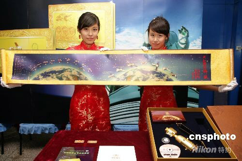 圖為工作人員展示為配合“神七”紀(jì)念金條發(fā)行的一幅1.6米神舟七號(hào)載人航天飛行紀(jì)念純金藏卷。