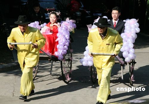 11月11日,江蘇南京的一對新人喜結(jié)良緣,新郎別出心裁地從南京夫子廟請來兩輛黃包車,接新娘進(jìn)門。簡樸環(huán)保型的婚慶方式既富個性又不失浪漫情調(diào)和時尚,成為街頭一道獨(dú)特的風(fēng)景。中新社發(fā) 鐘山 攝