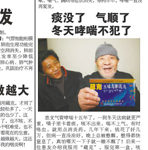 “患友介紹我服用了‘藏克’。服完第一盒,咳嗽、胸悶就緩解多了!弊蛱(22日),看著我市(重慶市)某報(bào)上的一則藥品廣告,90歲高齡的老人張治欽感到納悶,“我從來沒得過這病,卻上了該藥的宣傳廣告。”