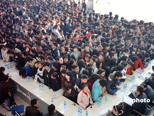 貴陽市某人力資源市場舉行的首場招聘會(huì)上,前來求職的返鄉(xiāng)農(nóng)民工和大學(xué)生擠滿了整個(gè)人才市場。經(jīng)過精心籌備,使當(dāng)天進(jìn)場招聘的單位達(dá)80余家,提供保安、保潔、廚師、服務(wù)員、焊工、建筑等崗位800多個(gè)。由于近段時(shí)間從外省返鄉(xiāng)的農(nóng)民工不斷增多,即將畢業(yè)的大學(xué)生和社會(huì)失業(yè)人員的求職需求也比較大,使得當(dāng)天的招聘會(huì)異;鸨,進(jìn)場招聘和求職的人員達(dá)到數(shù)千人,將人才市場擠得水泄不通。中新社發(fā) 彭年 攝