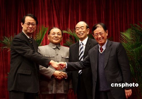 12月5日,中國人民和平外交促進(jìn)會(huì)、炎黃子孫熱愛祖國聯(lián)合會(huì)、中國偉人蠟像館等,在北京人民廣播電臺(tái)大廈啟動(dòng)“平福中日,世代之約”活動(dòng)。中國人民和平外交促進(jìn)會(huì)會(huì)長胡德平、日本國大使館公使泉裕泰參加了活動(dòng);顒(dòng)儀式上,中國人民向日本人民贈(zèng)送了一份特殊意義的禮物——以蠟像藝術(shù)形式再現(xiàn)30年前鄧小平和福田赳夫簽訂“中日和平友好條約”的歷史時(shí)刻。中新社發(fā) 張愛東 攝