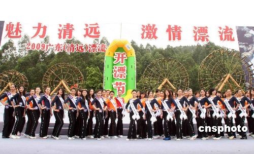 4月18日,“魅力清遠(yuǎn) 激情漂流”開(kāi)漂節(jié)的啟動(dòng)儀式在廣東省清遠(yuǎn)市舉行,參加2009國(guó)際旅游小姐中國(guó)區(qū)總決賽的61位佳麗在儀式上亮相。在接下來(lái)的10天里,選手們將參觀游覽清遠(yuǎn)的特色景點(diǎn),參加一系列的清遠(yuǎn)旅游宣傳推廣活動(dòng)。新一屆的國(guó)際旅游小姐大賽中國(guó)冠軍將在28日產(chǎn)生。 中新社發(fā) 劉鷹 攝