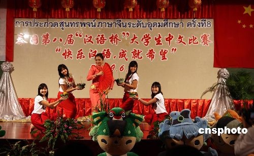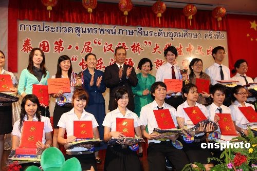 6月6日,由中國駐泰國大使館和泰國教育部高等教育委員會聯(lián)合舉辦的泰國第八屆“漢語橋”大學生中文比賽在曼谷城市酒店舉行。選拔自泰國朱拉隆功大學、法政大學、皇太后大學等19所精英大學的19名選手用地道的漢語闡述了“快樂漢語,成就希望”的大賽主題,表達了泰國大學生對中國的期盼與祝福。經(jīng)過4個多小時緊張激烈的比賽,由中泰雙方漢語專家組成的大賽評委會評出了一等獎2名、二等獎4名、三等獎6名、積極參與獎7名、優(yōu)秀組織獎2所大學。當日獲得一等獎的來自博仁大學的董詩碧和易三倉大學的江振茂兩位同學,將代表泰國到中國參加全球決賽,其他選手也獲得了到中國進參加秋令營的獎學金。中新社發(fā) 顧時宏 攝