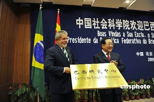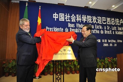 5月19日,正在對(duì)中國(guó)進(jìn)行國(guó)事訪問(wèn)的巴西總統(tǒng)盧拉在中國(guó)社會(huì)科學(xué)院舉行演講,表達(dá)進(jìn)一步鞏固巴中戰(zhàn)略伙伴關(guān)系的信心。圖為巴西總統(tǒng)盧拉與全國(guó)政協(xié)副主席、中國(guó)社會(huì)科學(xué)院院長(zhǎng)陳奎元共同為巴西研究中心揭牌。中新社發(fā) 李學(xué)仕 攝