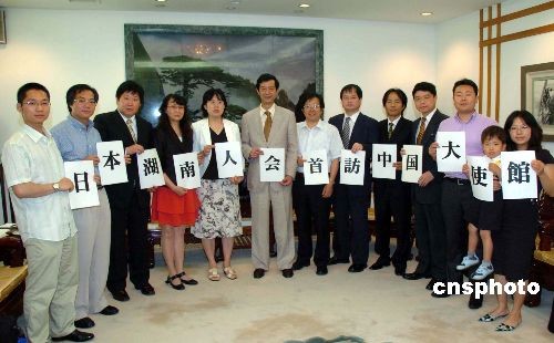 中國(guó)駐日大使館許澤友參贊兼總領(lǐng)事,7月2日下午在大使館會(huì)見了日本湖南之友會(huì)共同代表、日本湖南人會(huì)會(huì)長(zhǎng)段躍中一行,并和日本湖南人會(huì)的副會(huì)長(zhǎng)、理事們進(jìn)行了一個(gè)小時(shí)的座談。許澤友說(shuō),湖南有很深的文化底蘊(yùn),又有豐富的資源,發(fā)展?jié)摿艽。期待在日湖南人為促進(jìn)家鄉(xiāng)、祖國(guó)與日本的交流方面起橋梁和窗口的作用。圖為日本湖南人會(huì)理事和許澤友總領(lǐng)事(左六)、劉敬師領(lǐng)事(右四)合影。中新社發(fā) 段躍中 攝