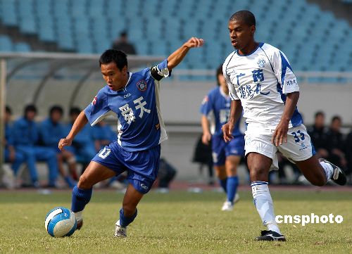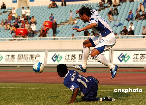 2007年10月20日下午,中甲聯(lián)賽第25輪的比賽打響。在南京奧體中心體育場(chǎng)進(jìn)行的一場(chǎng)比賽中,主場(chǎng)作戰(zhàn)的江蘇隊(duì)以1比0戰(zhàn)勝廣州隊(duì)。中新社發(fā) 劉建民 攝
