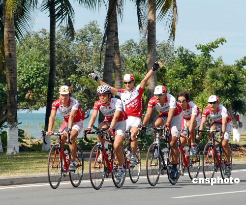 來(lái)自二十四個(gè)國(guó)家和地區(qū)的十八支參賽隊(duì)伍、一百零六名自行車(chē)手已于十一月二日全部抵達(dá)海南三亞。上午九時(shí)許,各隊(duì)選手開(kāi)始熱身,為明天開(kāi)始的海馬汽車(chē)二00七環(huán)海南島國(guó)際公路自行車(chē)賽做準(zhǔn)備。中新社發(fā) 彭小云 攝