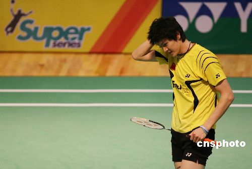 十一月二十九日,二零零七中國(guó)香港羽毛球超級(jí)賽進(jìn)行正賽第二輪的比賽,男單三號(hào)種子選手鮑春來(lái)因?yàn)橛夷_腳踝有傷宣布放棄比賽。中新社發(fā) 武仲林 攝