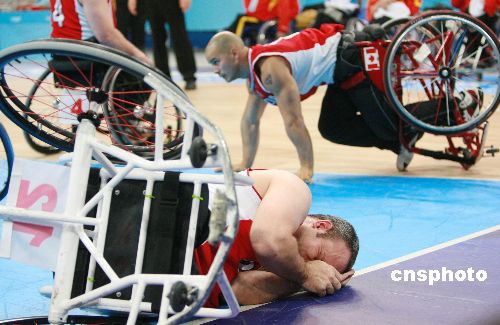 1月22日,“好運(yùn)北京”2008年國際輪椅籃球邀請賽在北京國家體育館繼續(xù)進(jìn)行,在男子組最后一輪比賽中,雅典殘奧會冠軍加拿大隊以69比47戰(zhàn)勝中國隊。三輪循環(huán)賽過后,加拿大隊2勝1負(fù)很可能獲得預(yù)賽第二名,中國隊三戰(zhàn)皆負(fù)排名第四。圖為比賽中加拿大隊兩名隊員由于拼搶激烈摔倒在球場上。中新社發(fā) 廖文靜 攝
