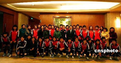 2月20日晚,重慶市婦聯(lián)主席蘭運華一行代表全市1500萬婦女和球迷看望慰問中國女足的全體隊員和教練員,希望她們再創(chuàng)佳績。同時向姑娘們贈送了鮮花、“鏗鏘玫瑰”書法、重慶特色的三峽碟畫等。中新社發(fā) 陳仕川 攝