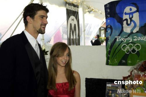 當?shù)貢r間5月10日晚在巴爾的摩游泳俱樂部舉行的“巴爾的摩北京奧運奪金倒計時”籌款晚會上,上屆奧運曾經(jīng)為美國隊奪得六枚金牌的美國游泳男一號種子選手邁克爾·費爾普斯被眾多來賓爭相邀請合影。圖為一名美國少女爭取機會和邁克爾合影。中新社發(fā) 邱江波 攝