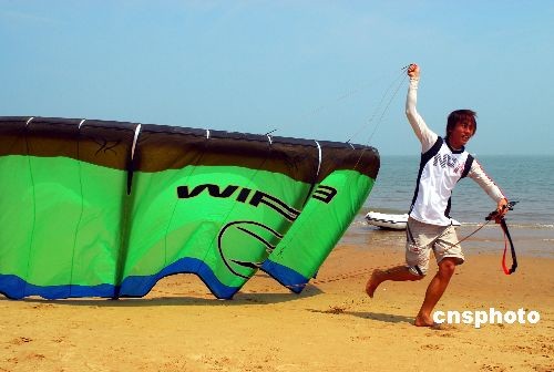 3月19日,為期兩天的“2009?诜弭唢L(fēng)箏沖浪邀請賽”在海口市西秀海灘開幕。這是我國首次舉辦國際性風(fēng)箏沖浪大賽。比賽設(shè)公開級風(fēng)箏沖浪場地賽、風(fēng)箏沖浪自由花式賽、公開級帆板場地賽和特邀組帆板場地賽等多個項目。中新社發(fā) 善平 攝