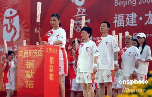 5月13日下午,北京奧運(yùn)火炬在革命老區(qū)龍巖結(jié)束“紅色之旅”。圖為閉幕儀式上,來(lái)自福建的火炬手向四川地震災(zāi)區(qū)人民捐款。 中新社發(fā) 王東明 攝