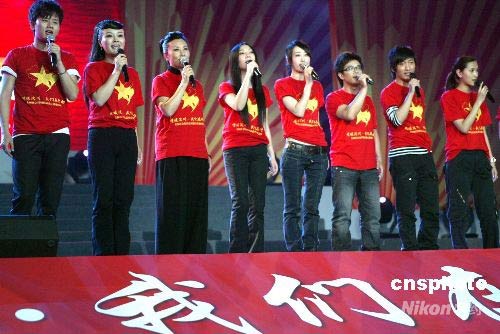5月25日晚,由13家國(guó)家一級(jí)社會(huì)組織共同主辦的“情暖汶川·我們?cè)谛袆?dòng)——全國(guó)社會(huì)組織抗震救災(zāi)募捐義演”在北京首都體育館舉行,來自社會(huì)各界的1萬余名觀眾參加了此次募捐活動(dòng),F(xiàn)場(chǎng)籌得款物將通過中華慈善總會(huì)全部捐給地震災(zāi)區(qū)。中新社發(fā) 趙雋 攝