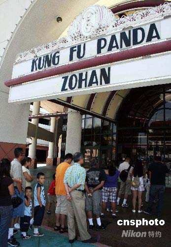 當(dāng)?shù)貢r間6月7日,由成龍和劉玉玲等好萊塢著名影星配音的動畫片《功夫熊貓》在美國洛杉磯各大影院上映。當(dāng)?shù)孛癖娕抨?duì)購票觀看新片。劉玉玲希望這部影片能借助2008北京奧運(yùn)的“中國熱”問鼎北美票房。 中新社發(fā) 金立冬 攝