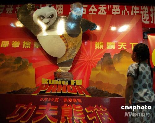 7月3日,北京一家影院《功夫熊貓》的海報(bào)吸引兒童。美國動(dòng)畫片《功夫熊貓》在國內(nèi)上映后,票房勢(shì)如破竹,一路飄紅。截止到上周日,影片全國票房達(dá)到9688萬元,破億目標(biāo)近在咫尺,已成為最賺錢的進(jìn)口動(dòng)畫片。中新社發(fā) 九州 攝