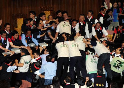 現(xiàn)場(chǎng)“立委”多人扭打成一團(tuán),民進(jìn)黨“立委”以潑水、丟東西等方式抗議,該黨“立委”郭玟成、劉建國(guó)跌下摔落,國(guó)民黨“立委”吳育升也受傷。