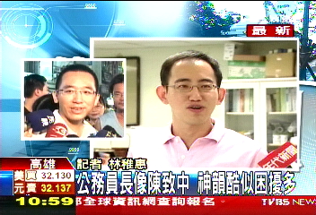 中新網(wǎng)7月26日電 據(jù)臺灣TVBS電視臺報道,陳致中卷入召妓疑云,也讓另外一個人有點(diǎn)困擾,那就是高雄市政府社會局的課員張福仁;跟陳致中同年齡,身高比陳致中高一點(diǎn),兩個人乍看之下還真的有點(diǎn)像,走在路上,偶爾會被人說長的像,雖然不反感,但神似陳致中,在這敏感時期還真是有點(diǎn)尷尬。