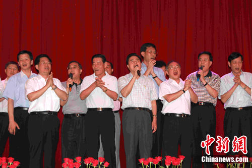 中新網(wǎng)臺南8月22日電 廣東省省長黃華華率領的廣東經(jīng)貿(mào)文化代表團21日在臺南訪問。圖為21晚黃華華與廣東省其他隨訪官員與臺灣奇美實業(yè)股份有限公司董事長廖錦祥等公司負責人及員工聯(lián)歡,登臺合唱一曲《愛拼才會贏》,表達了兩岸合作拼搏共創(chuàng)輝煌的共同愿望。 中新社記者 張傳熙 攝影