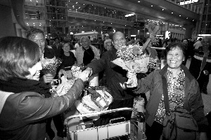 昨晚,首批被困北京游客抵京。20時(shí)剛過,游客紛紛走下飛機(jī),多為白發(fā)老人。在接機(jī)口,神舟國旅工作人員將鮮花送到老人手上,老人們表示感謝,“我們命大,感謝大家關(guān)心!