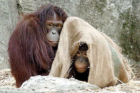 臺北市動物園里的猩猩也冷到受不了,蓋著麻布抵擋寒風(fēng),沒搶到的只好依偎在同伴身旁取暖。(圖:臺灣《中國時報》)