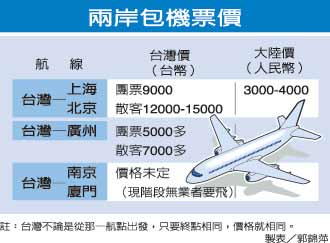東南旅行社經(jīng)理黃國軒表示,由于各家航空公司直航包機的起降時間還未最后敲定,若排在好時段,也會比一般時段票價高出五百至八百元。