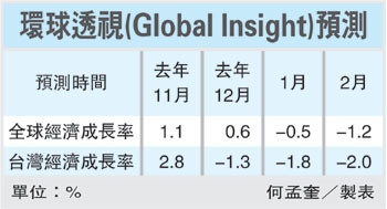 中新網(wǎng)2月18日電 臺灣《經(jīng)濟日報》18日頭條新聞報道說,環(huán)球透視(Global Insight)剛發(fā)布最新經(jīng)濟預(yù)測,再度下修臺灣今年經(jīng)濟成長率,并下修到負(fù)成長2.0%,甚至比全球經(jīng)濟負(fù)成長1.2%還差。