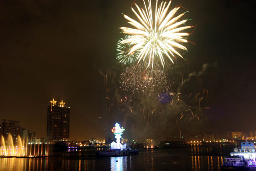設(shè)在高港光榮碼頭海域的主燈,搭配煙花水舞,璀璨繽紛。(圖:臺灣《聯(lián)合報》)