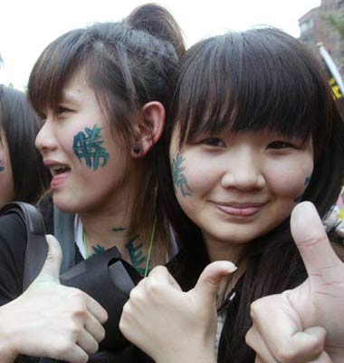 民進(jìn)黨活動上參加活動年輕人在臉上寫“勝”字挺謝長廷。 聯(lián)合報圖