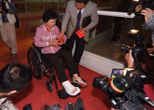 臺(tái)中乾隆旅行社團(tuán)員在四川發(fā)生強(qiáng)震時(shí),遭落石擊中腳踝,十五日凌晨坐輪椅返臺(tái),所幸沒(méi)有生命危險(xiǎn),旅行社也送上紅包。(“中央社”圖)