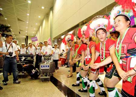 兩岸周末包機(jī)啟動(dòng),大陸來(lái)臺(tái)觀光首發(fā)團(tuán)四日抵達(dá)桃園機(jī)場(chǎng)后,受到南投縣少數(shù)民族的載歌載舞歡迎,也成為觀光客目光焦點(diǎn)。 “中央社”圖
