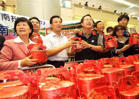 兩岸周末包機(jī)啟動,大陸客首發(fā)團(tuán)四日抵臺,擁有日月潭地利的南投縣,由縣長李朝卿(左四)親自領(lǐng)軍,前往桃園機(jī)場接機(jī),歡迎大家到南投觀光。 “中央社”圖